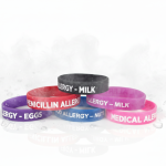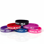 These high-visibility Silicone Medical Alert Bracelets are designed for immediate identification of critical conditions and allergies in an emergency. Made from 100% hypoallergenic, latex-free silicone, they are comfortable, waterproof, and durable for daily wear by children and adults. The bracelets feature clear, contrasting text (Milk Allergy, Nut Allergy, Penicillin Allergy, Egg Allergy, Medical Alert) debossed and filled with white ink for maximum visibility, ensuring that first responders, teachers, and caregivers are instantly aware of vital health information. Sold as an assorted set to cover multiple common conditions and allergies.